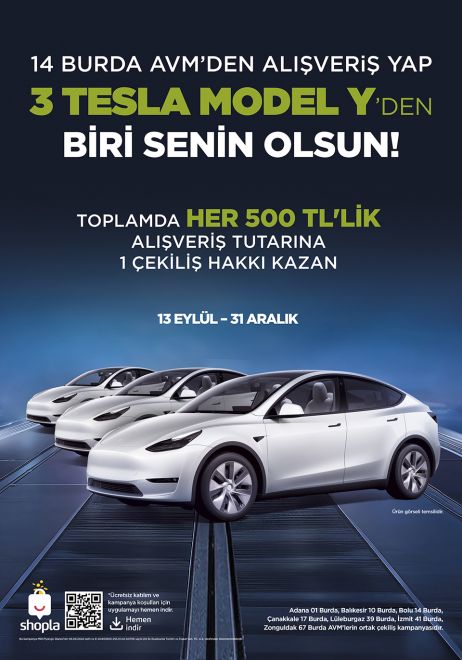 Türkiye’nin önde gelen gayrimenkul yatırım ve varlık yönetimi şirketlerinden Esas Gayrimenkul; yatırımcısı olduğu Burda AVM’lerde yapılan çekiliş kampanyası ile ziyaretçilerine 3 adet “Tesla Model Y”den birini kazanma şansı sunuyor. 01 Burda Adana, 10 Burda Balıkesir, 14 Burda Bolu, 17 Burda Çanakkale, 39 Burda Lüleburgaz, 41 Burda İzmit ve 67 Burda Zonguldak AVM ziyaretçilerine yönelik olarak düzenlenen ortak çekiliş kampanyası; 13 Eylül 2024 saat 10.00 ile 31 Aralık 2024 saat 20.00 tarihleri arasında gerçekleştirilmektedir. 14 Burda AVM ziyaretçileri, alışveriş merkezinde bulunan mağazalardan yapacakları, toplamda her 500 TL’lik alışveriş tutarına 1 çekiliş hakkı kazanacak ve çekiliş sonucunda toplam 3 adet Tesla Model Y, sahiplerini bulacaktır. Katılım başvuruları, 14 Burda AVM’nin mobil uygulaması “Shopla” üzerinden gerçekleşmektedir. Çekilişe katılmak için, 14 Burda AVM’den yapılan alışverişlerin fiş/faturaları, AVM’nin mobil uygulaması “Shopla” ya yüklenmelidir.