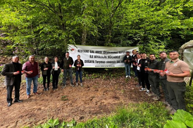 kapsamda Bolu Orman Bölge Müdürlüğü laboratuvarında üretilen 4 bin adet Torymus Sinensis'in Orman Zararlılarıyla Mücadele Şube Müdürlüğü ve Akçakoca Orman İşletme Müdürlüğü personellerinin katılımıyla Altınçay ve Cumayanı Orman İşletme Şefliklerine ait kestane ormanlarına salımı yapılmıştır.