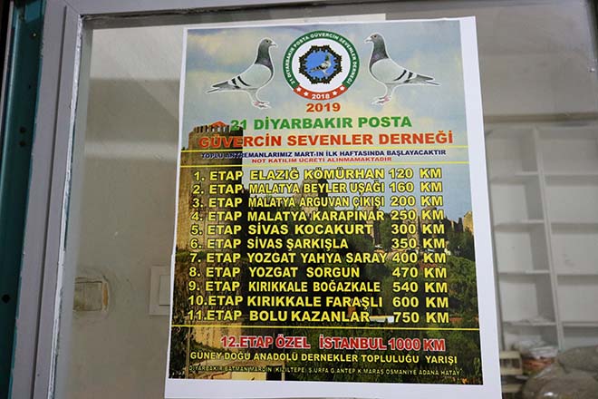 21 Diyarbakır Posta Güvercin Sevenler Derneği, fiyatları 5 lira ile 20 bin lira arasında değişen posta güvercinlerine yönelik yarışma düzenledi. 12 etaplı yarışmanın bin kilometrelik özel İstanbul etabı için 120 güvercine çip ve numaralar yerleştirildi. İstanbul'dan bırakılacak güvercinler arasında hangi ilin kuşu birinci gelirse iller arasındaki mesafe hesaplanıp ona göre birinci hesaplama işlemiyle belirlenerek neslinin devamı için koruma altına alınacak.