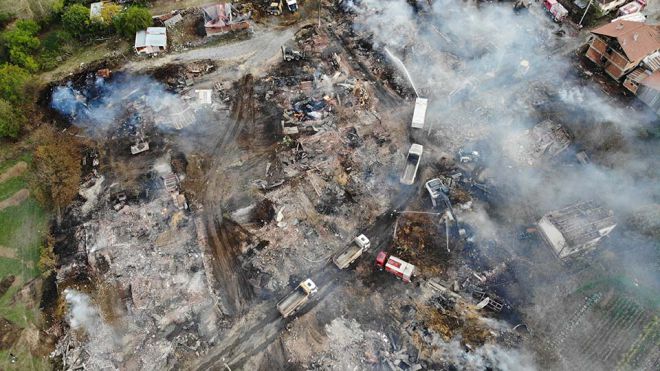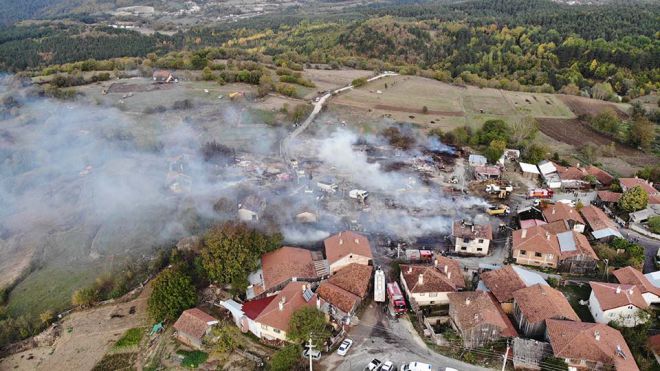 Alevlere teslim olan ve 12 evin küle döndüğü Kuzfındık köyünün havadan görüntüsü facianın büyüklüğünü gözler önüne serdi.