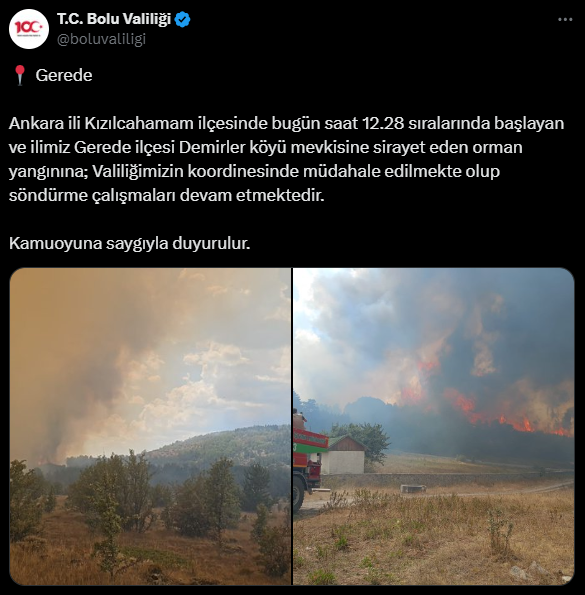 Yangın, Ankara'nın Kızılcahamam ilçesinde Şahinler Mahallesi'nde meydana geldi. Edinilen bilgiye göre, anız yangını olarak başlayan yangın rüzgarın etkisiyle büyüyerek ormanlık alana sıçradı. Ankara ile Bolu'nun sınırında büyüyen yangına çok sayıda itfaiye ekibi, arazöz, tanker ve 2 helikopter sevk edildi. Bölgede etkili olan şiddetli rüzgar sebebiyle Demirler Köyü'ne alevler yaklaştı. Bolu Valiliği tarafından yapılan açıklamada, “Ankara ili Kızılcahamam ilçesinde bugün saat 12.28'de başlayan ve ilimiz Gerede ilçesi Demirler Köyü mevkiine sirayet eden orman yangınına valiliğimizin koordinesinde müdahale edilmekte olup, söndürme çalışmaları devam etmektedir” ifadelerine yer verildi. Yangını söndürmek için ekiplerin mücadelesi sürüyor.