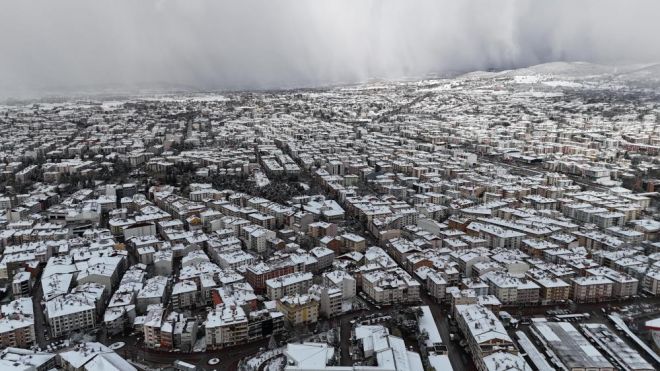 Meteoroloji Genel Müdürlüğü'nün uyarıları doğruldu Bolu'da gece saatlerinde kar yağışı başladı. Kar yağışının zaman zaman yoğun şekilde etkili olduğu kent merkezi beyaza büründü. Sabah saatlerinde etkisini artıran kar yağışı binaların çatılarını beyaz örtüyle kapladı. Bahar ayında kış güzelliğine bürünen kent merkezi dronla havadan görüntülendi. Yeşil alanlarda kar kalınlığı yer yer 10 santimetreye ulaştı. Kar yağışının gün boyunca aralıklarla devam etmesi bekleniyor.