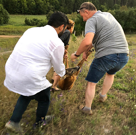 Edinilen bilgiye göre, Bolu’nun Mengen ilçesinde yaşayan Ferhat Aktay’a ait evin bahçesine yavru karaca girdi. Çevresi dikenli tellerle örülü bahçeden çıkmaya çalışan yavru karaca, tellere takıldı. Bahçesinden gelen sesleri duyarak evinden çıkan Aktay, karacanın tellerde takıldığını görünce durumu Doğa Koruma ve Milli Parklar Müdürlüğü ekiplerine haber verdi. Aktay’ın ekipleri beklediği sırada, doğa yürüyüşü yapan bir grup tellere takılı kalan karacayı gördü. Doğa yürüyüşü yapan grubun da yardımıyla yavru karaca, Milli Parklar ekipleri gelmeden önce tellerden kurtarıldı. Karacanın tellerden dolayı kanayan bölgelerini suyla temizleyen grup, daha sonra yavru karacayı doğal ortamına bıraktı.