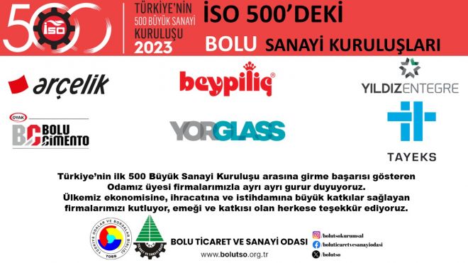 Araştırma sonuçlarını değerlendiren Başkan Alemdar; “ İstanbul Sanayi Odası’nın her yıl açıklamakta olduğu Türkiye’nin İlk 500 Büyük Sanayi Kuruluşu Araştırmasının 2023 yılı sonuçlarına göre İlimizde faaliyet gösteren Odamıza kayıtlı 7 firma listeye girme başarısı göstermiştir. Bu firmalardan İlimiz merkezli bir firmamız 71. Sırada, Beypi Beypazarı Tarımsal Üretim Pazarlama A.Ş. ise 100. sırada yer aldı. Listeye girme başarısı gösterip de merkezi ilimiz dışında olup İlimizde üretim faaliyetinde bulunan firmalarımızdan Arçelik A.Ş. 7. sırada, Yıldız Entegre A.Ş. 27. sırada, Oyak Çimento A.Ş. 47. sırada, Tayeks Dış Ticaret Tekstil A.Ş. 341. sırada ve Yorglass Cam A.Ş. 364. sırada yer aldılar. Bolu iş dünyasının çatı kuruluşu olan Bolu Ticaret ve Sanayi Odası olarak Ülkemiz ekonomisine, ihracatına ve istihdamına büyük katkılar sağlayan, her yıl giderek büyümeyi devam ettirerek Türkiye’nin İlk 500 Büyük Sanayi Kuruluşu arasına girme başarısı gösteren Odamız üyesi firmalarımızla ayrı ayrı gurur duyuyor, başarılı çalışmalarından ötürü kutluyor, emeği ve katkısı olan herkese teşekkür ediyoruz” dedi.