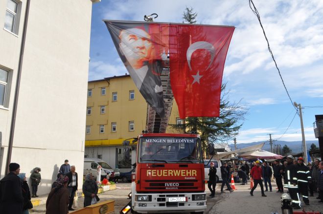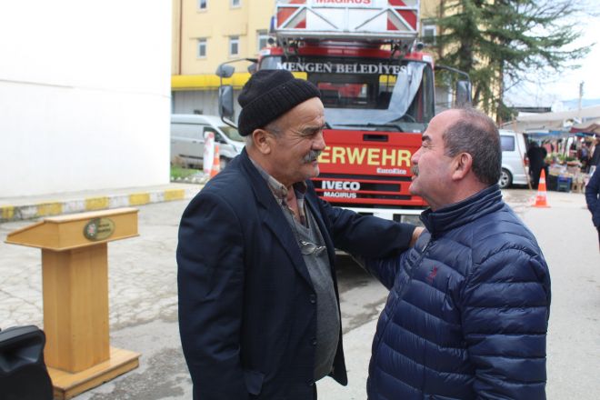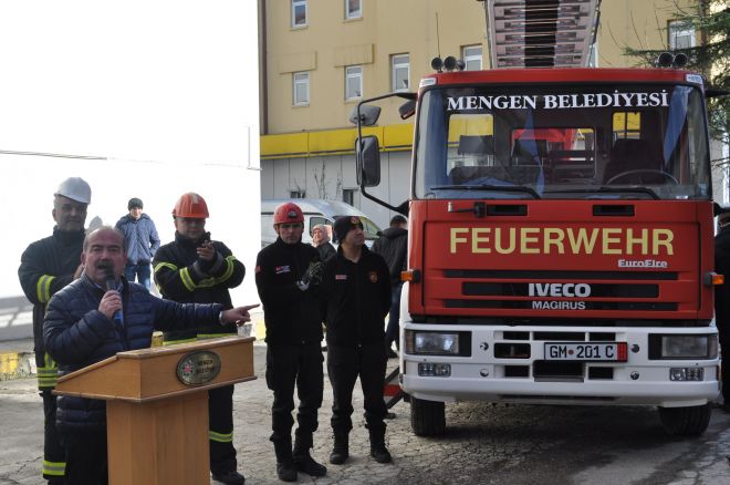 16 Ekim 2023’te Mengen Belediye Başkanı Turhan Bulut’un girişimleriyle Almanya’dan teslim alınan 24 metrelik merdivene sahip itfaiye aracı, gerekli tüm resmi işlemlerin tamamlanmasının ardından Mengen’e ulaştı ve vatandaşların hizmetine sunuldu. Törende konuşma gerçekleştiren Başkan Bulut, Mengen’in önemli bir eksikliğinin giderildiğini vurgulayarak, hayırsever vatandaşlara şükranlarını sundu. Ayrıca, bu aracın kullanılmasını gerektirecek herhangi bir yangın veya olumsuz durumun yaşanmamasını temenni eden Başkan Bulut, törene katılan herkese teşekkürlerini iletti. Tören sonrasında belediye personeli, halka çorba ikramında bulunurken vatandaşlar da itfaiye aracının ilçeye kazandırılmasında büyük emekleri olan Mengen Belediye Başkanı Turhan Bulut’a teşekkürlerini sundu.