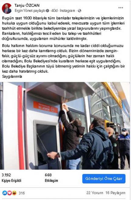 “Bugün saat 16.00 itibariyle tüm bankalar taleplerimizin ve işlemlerimizin hukuka uygun olduğunu kabul ederek, mevzuata uygun tüm işlemleri taahhüt etmekle birlikte belediyemize yasal başvurularını yapmışlardır. Bankaların, haklılığımızı tescil eden bu talep ve taahhütleri doğrultusunda, uygulanan mühürler kaldırılmıştır. Bolu halkının hakkını koruma konusunda ne kadar ciddi olduğumuzu herkese bir kez daha kanıtlamış olduk. Bizim dönemimizde zengin-fakir, güçlü-güçsüz ayrımı olmadığını, güçlülerin her zaman haklı olamadığını, Bolu Belediyesi’nde kuralların herkese eşit uygulandığını, Bolu Belediye Başkanı’nın tüyü bitmemiş yetimin hakkı için çalıştığını bir kez daha hatırlatmış olduk. Saygılarımla”