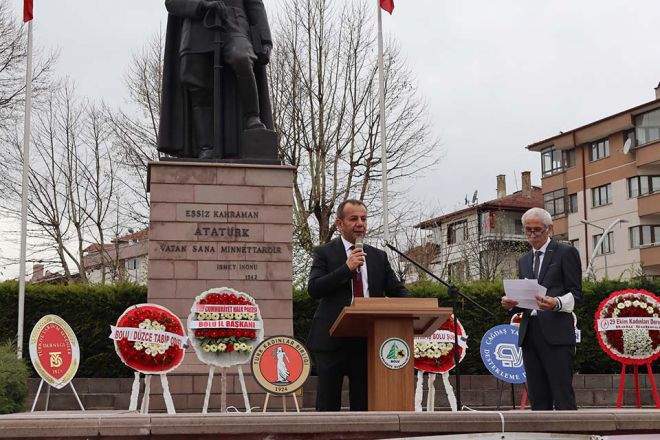 Bolu Belediye Başkanı Tanju Özcan, Anıtpark’ta yaptığı konuşmasına 23 Nisan Ulusal Egemenlik ve Çocuk bayramını kutlayarak başladı. Başkan Özcan konuşmasında şu ifadelere yer verdi; “Her bayramın bir yaşanılmışlığı var. 23 Nisan, kurtuluş savaşı aşamasında farklı bir noktaya gelindiğini milli egemenliğin tekrar halka geri iade edildiği gündür benim açımdan. Milli bayramlarımızdan ilkidir. Türkiye Büyük Millet Meclisinin açılması suretiyle padişahta olan yetkinin ilk kez millete verilmesi dünyadaki en önemli devrimlerden biri olarak kabul edilmelidir. En azından benim için bu böyledir. Özellikle Kurtuluş savaşının sona erdiği ve Cumhuriyetin kurulduğu yıl olan 1923 ve 1924 yıllarında 23 Nisan kutlamaları çok büyük bir coşku içersinde geçmiş. O anlamda bizim bu bayramımızı çocuklarımıza sadece çocuk bayramı gibi değil hangi sebeplerle bu bayramın çocuklara armağan edildiğini bıkmadan ve usanmadan anlatmamız gerekir diye düşünüyorum. Mustafa Kemal Atatürk’ün izinden giden yöneticiler ve bireyler olarak Ulu önderimizin ülkemizin geleceğiyle ilgili planladıklarını hayata geçirmemiz gerekir diye düşünüyorum. Bunu da yapabilecek güçte olduğumuzu görüyorum. Her geçen gün bu toplumda Mustafa Kemal Atatürk’ün önemi ve değeri daha da anlaşılır bir hale geldi. Bunda yaşadıklarımızın da etkisi var. Samimiyetle söylüyorum bugün, bu toplum 20 yıl öncesine oranla çok daha fazla bir şekilde Mustafa Kemal Atatürk’ün değerini anlıyor. Keşke Mustafa Kemal Atatürk’ün değerini anlamak için bu yirmi yılı yaşamış olmasaydık. Her şerden bir hayır doğar derler. Bu ülkeyi 20 yıldır yönetenler, bu topluma Mustafa Kemal Atatürk ve devrimlerinin ne kadar önemli olduğunu hatırlattılar. İnşallah bir daha unutmayız. Umarım önümüzdeki 23 Nisan’ı daha farklı bir iklimde, ülkenin tekrar aydınlık günlerinin başlangıcında kutlamayı temenni ediyorum. “