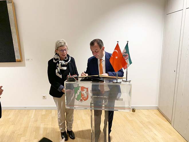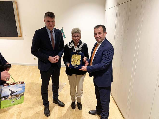 Bolu Belediye Başkanı Tanju Özcan, Almanya’da ilk olarak Türkiye Cumhuriyeti Düsseldorf Başkonsolosu Ayşegül Gökçen Karaarslan’a nezaket ziyaretinde bulundu. Konsolosluk binasındaki buluşmanın ardından Başkan Özcan, Düsseldorf Eyalet Meclisi’ne geçerek, Demokrat Parti Milletvekili ve Parlamenterler Türkiye Grubu Başkanı Carina Gödecke ile bir araya geldi.