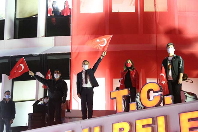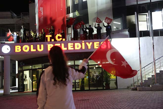 Akşam saatlerinde ise belediye binasının asma katında belediye bandosu tarafından mini bir konser düzenledi. Bolu Belediye Bandosu tarafından çalınan marşlar ile belediye personellerine ve belediye önünde toplanan yüzlerce kişiye bayram coşkusu yaşatıldı. Ellerindeki Türk bayrakları ile alana koşan Bolulu vatandaşlar ve belediye binasının camlarına çıkan belediye personelleri, marşlara eşlik ederek, Cumhuriyet Bayramı’nı coşkuyla kutladı.