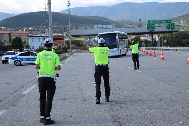 Bolu İl Emniyet Müdürlüğü’ne bağlı trafik ekipleri, Türkiye’nin en önemli karayolu geçiş güzergahlarından birisi olan Bolu’da, Kurban Bayramı tatili boyunca sürücülerin rahat yolculuk yapabilmesi ve kazaların önlenmesi amacıyla tedbirlerini artırdı. Kazaların yoğun olduğu bölgelerde radarla hız denetimlerini sıklaştıracak olan ekipler, yorgun görünen sürücüleri ise, araç dışında dinlenmelerini sağlayacak. Bolu Batı Gişeleri’nde trafik uygulaması yapan ekipler, sürücüleri trafik kurallarına uymaları konusunda uyarılarda bulunarak, bayram boyunca alınacak tedbirlerle ilgili bilgilendirdiler.