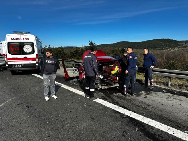 Kaza, Anadolu Otoyolu Bolu kesimi İstanbul istikametinde meydana geldi. Edinilen bilgiye göre, M.G. idaresindeki 06 AAK 22 plakalı otomobil, aynı istikamette seyreden F.A.A. yönetimindeki 06 DOl 796 plakalı cip ile çarpıştı. Kazanın şiddetiyle araçlar ezilirken ihbar üzerine olay yerine sağlık, polis, itfaiye ve jandarma ekipleri sevk edildi. Kısa sürede olay yerine gelen sağlık ekipleri yaralanan 2 otomobil sürücüsü ile yolcu N.G'ye ilk müdahaleyi yaptı. Ambulansa alınan 3 yaralı ambulansla hastaneye götürüldü. Hurdaya dönen araçlar yoldan kaldırılırken, olayla ilgili inceleme başladı.