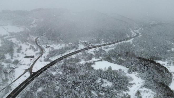 Meteoroloji Genel Müdürlüğü'nün kar yağışı uyarısının ardından, Bolu Dağı'nda gece saatlerinden itibaren etkili olan kar yağışı yoğun şekilde devam ediyor. Kar kalınlığının 30 santimetreyi geçtiği bölgede, Karayolları ve bölge trafik ekipleri çalışmalarını sürdürüyor.Ekipler, sürücülerin dikkatli olmalarını isterken, kar lastiği bulunmayan ya da dört mevsim lastiksiz araçların güzergahta dikkatli seyretmeleri gerektiğini vurguladı. Nisan ayında yağan yoğun karla birlikte beyaza bürünen Bolu Dağı, dron ile havadan görüntülendi.