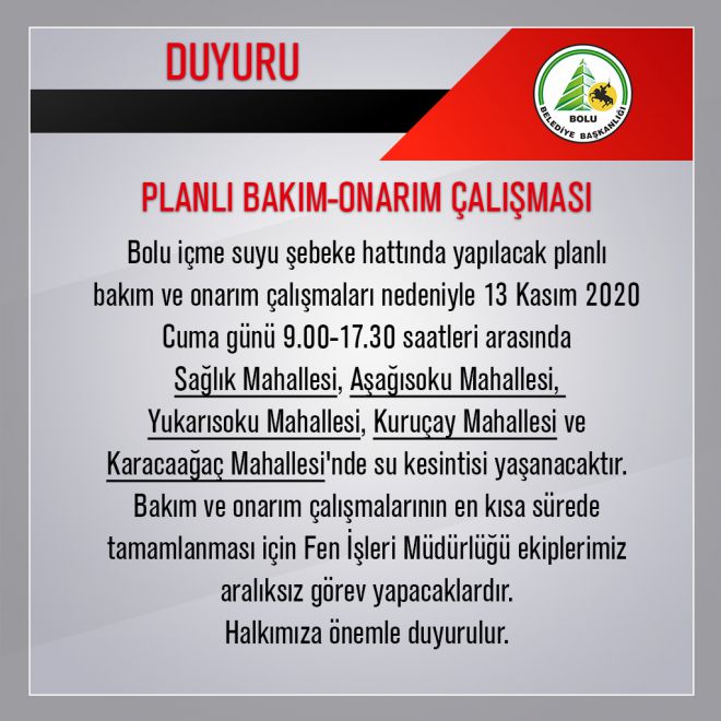 Konuya ilişkin Bolu Belediyesi'nden yapılan duyuruda, "Bolu içme suyu şebeke hattında yapılacak planlı bakım ve onarım çalışmaları nedeniyle 13 Kasım 2020 Cuma günü 9.00-17.30 saatleri arasında Sağlık Mahallesi, Aşağısoku Mahallesi, Yukarısoku Mahallesi, Kuruçay Mahallesi ve Karacaağaç Mahallesi'nde su kesintisi yaşanacaktır. Bakım ve onarım çalışmalarının en kısa sürede tamamlanması için Fen İşleri Müdürlüğü ekiplerimiz aralıksız görev yapacaklardır. Halkımıza önemle duyurulur." denildi.