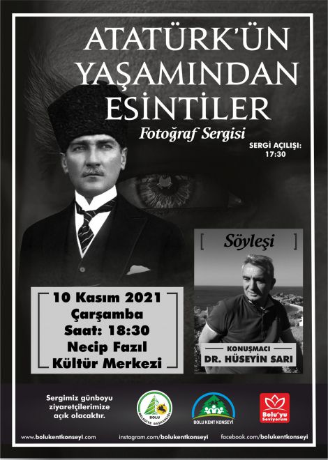 Bolu Belediyesi ve Kent Konseyi, 10 Kasım Atatürk’ü Anma Günü sebebiyle bir dizi etkinlik gerçekleştiriyor. ‘Atatürk’ün Yaşamından Esintiler’ adlı etkinlikler kapsamında ilk olarak 10 Kasım 2021 Çarşamba günü Saat: 17.30’da Bolu Belediyesi Necip Fazıl Kültür Merkezi’nde Atatürk fotoğraflarından oluşan bir resim sergisi gerçekleştirilecek. Serginin ardından Saat: 18.30’da ise Dr. Hüseyin Sarı’nın konuşmacı olarak katılacağı söyleşi gerçekleştirilecek.