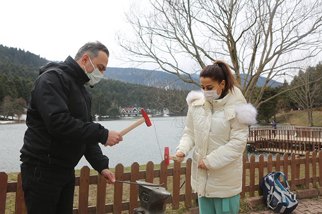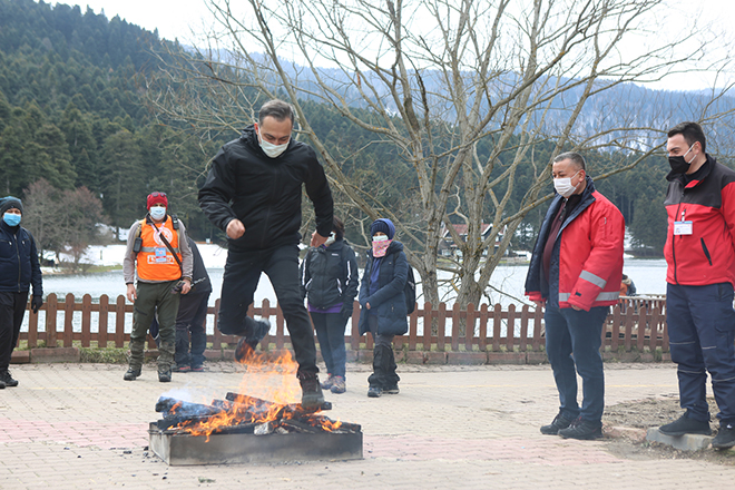 Doğaseverlerin yürüyüşü, göl kenarındaki iskeleye ulaşmalarının ardından sona ererken, Nevruz Bayramı kutlamaları buradaki etkinliklerle devam etti. Etkinliklere Bolu Belediye Başkan Yardımcıları Asuman Şentürk Tekin ile Belediye Başkan Yardımcısı ve Belediye Başkanlığı Sözcüsü Rasim Özdemir de katıldı. Başkan Yardımcıları Asuman Tekin ve Rasim Özdemir, katılımcılarla birlikte Nevruz’u yakılan ateşinin üzerinden atlayıp, örste demir döverek kutladı. İkili daha sonra nevruz geleneklerinden olan yumurta tokuşturmayı da ihmal etmedi.