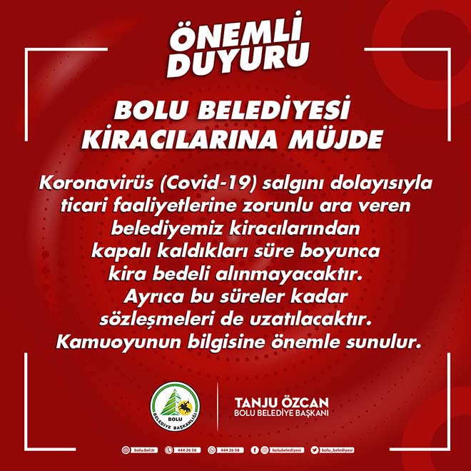 Konuya ilişkin Bolu Belediyesi’nden yapılan açıklamada, “Çin’in Vuhan kentinde başlayarak dünyayı tehdit etmeye devam eden koronavirüs (Covid-19) salgınından vatandaşlarımızı korumak ve salgının yayılmasını engellemek amacıyla İçişleri Bakanlığı tarafından bazı işyerinin faaliyetleri geçici olarak durdurulmuştu. Bu kapsamında belediyemiz kiracısı olan ve ticari faaliyetlerine zorunlu ara veren işletmelerden Çevre ve Şehircilik Bakanlığı’nın yayımladığı genelde gereği kapalı kaldıkları süre boyunca kira bedeli alınmayacaktır. Ayrıca bu süreler kadar sözleşmeleri de uzatılacaktır. Kamuoyunun bilgisine önemle sunulur.” denildi.