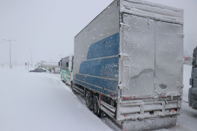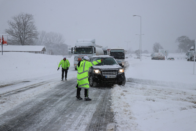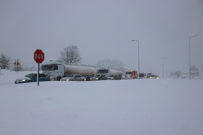 Bolu Dağı’nın D-100 karayolu ve TEM Otoyolu geçişinde dün başlayan yoğun kar yaşı sabah saatlerinden itibaren şiddetini artırdı. Bolu Dağı’nın özellikle D-100 karayolu geçişinde etkisini artıran kar yağışı zaman zaman trafiğin durmasına neden oldu. Bolu yönünden İstanbul istikametine giden tırlar, D-100 karayolu Elmalık kavşağında trafik ekipleri tarafından durdurularak geri gönderiliyor. Ankara istikametinde ise Kaynaşlı mevkisinde yağışın yoğun olduğu zamanlarda ağır tonajlı araçların geçişine izin verilmiyor. Karayolları ekiplerinin yolu temizlemesinin ardından araçların geçişine izin veriliyor. Karayolları ekipleri, D-100 Karayolu ve TEM Otoyolu Bolu geçişinde aralıksız olarak küreme ve tuzlama çalışmalarını sürdürüyor.