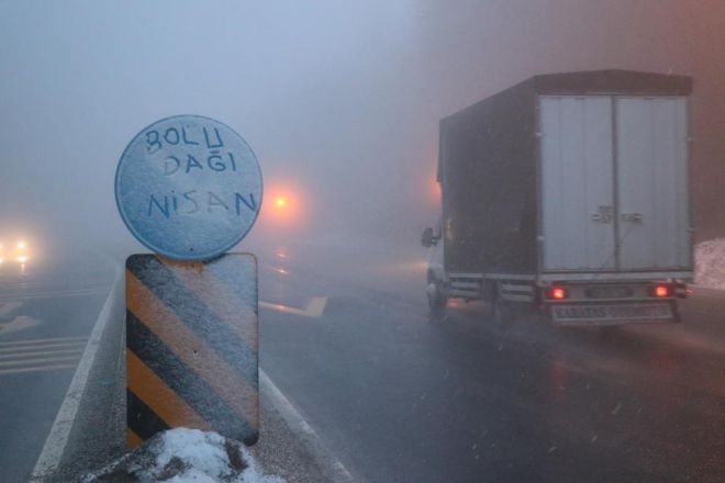 Bolu’da, sabah saatlerinden itibaren yüksek kesimlerde etkili olan sağanak yağış ve yoğun sis yerini kar yağışına bıraktı. Özellikle, D-100 karayolu Bolu Dağı kesimi Yumrukaya, Abant Kavşağı, Elmalık, Bakacak, Seymenler, Karanlıkdere, Bıçkıyanı, Sarıçökek bölgesinde etkili olan sis ve kar yağışı sebebiyle sürücüler zor anlar yaşadı. Sis nedeniyle görüş mesafesinin yer yer 5 metreye kadar düştüğü Bolu Dağı’nda sürücüler takip mesafelerini korumaları ve hız yapmamaları konusunda ışıklı tabelalar ve polis ekipleri tarafından uyarılıyor.