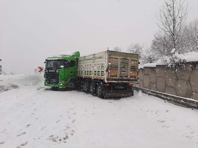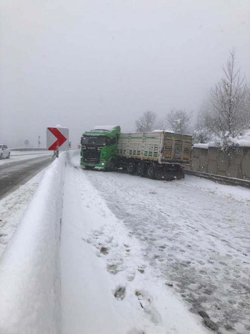 Türkiye’nin en önemli geçiş güzergahlarından olan Bolu Dağı’nda kar yağışı etkisini giderek arttırıyor. İstanbul’dan Ankara istikametine seyir eden A.Y. idaresindeki 54 PR 489 plakalı Scania marka tır, Bakacak mevkiinde yoğun kar yağışı sebebiyle makasladı. Tırın makaslaması sonrası Bolu Dağı Ankara istikameti trafiğe kapandı. İhbar üzerine olay yerine gelen ekipler, Bolu Dağı’na çıkış noktası olan Kaynaşlı mevkiinde otomobil, kamyon ve tırların çıkışına izin vermedi. Emniyet ekipleri ve Karayolları ekipleri makaslayan tırın kaldırılması için bölgede çalışma başlattı. Çalışmanın ardından makaslayan tır kurtarılarak, Kaynaşlı mevkiinde bekletilen araçlar Bolu Dağı Ankara istikametine yönlendirilmeye başlandı.
