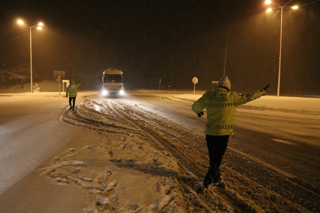 Bolu Dağı’nın D-100 karayolu ve TEM Otoyolu geçişinde gün boyu aralıklarla yağan kar akşam saatlerinde etkisini artırdı. Bolu Dağı’nın özellikle D-100 karayolu geçişinde etkisini artıran kar yağışı zaman zaman ulaşımı aksattı. Bolu yönünden gelerek İstanbul istikametine giden tırların geçişine izin verilmiyor. D-100 kara yolu Elmalık kavşağında trafik ekipleri tarafından durdurulan tırlar geri gönderiliyor.