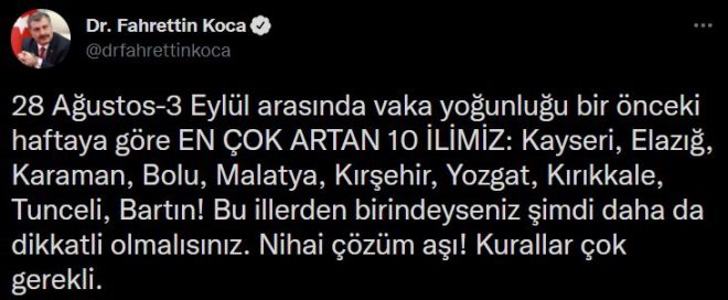 Bakan Koca, 28-Ağustos-3 Eylül arasında vaka yoğunluğu bir önceki haftaya göre en çok artan 10 ili de bildirdi. Buna göre iller sırasıyla, Kayseri, Elazığ, Karaman, Bolu, Malatya, Kırşehir, Yozgat, Kırıkkale, Tunceli, Bartın olarak kaydedildi. Bakan Koca, vatandaşlara bu illerden birinde olmaları durumunda daha da dikkatli olmaları gerektiğini işaret ederek, “Nihai çözüm aşı! Kurallar çok gerekli” dedi.