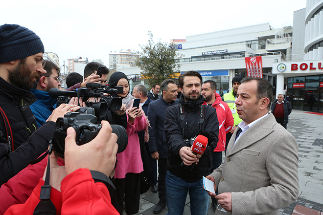 Bolu Belediye Başkanı Tanju Özcan, Alınan önlemlerle ilgili belediye meydanında basın mensuplarının karşısına geçti. Burada korona virüsle mücadele için belediye bünyesinde bir ekip kurduklarını ifade eden Özcan, “10 araç ve yaklaşık 50 personelle ‘Paniğe kapılmadan, hafife almadan, sevdiklerimizi koruyoruz’ ekibi kurduk. On araçla Bolu’daki bütün camilerimizi, çöp ve kamusal alanlarımızı dezenfekte etmeye devam ediyoruz. Türkiye’de nüfusuna göre en fazla dezenfektanı kullanan belediye biziz. Arkadaşlarımız özverili bir şekilde Bolu halkının sağlığını korumak için büyük bir gayretle çalışmalarını sürdürüyorlar. Şuana kadar 10 tonun üzerinde dezenfeksiyon kullandık, kapalı alanlarla ilgili. Yollarımız ve ana arterlerimiz dezenfekteli suyla yıkandı. Pazar yerlerimiz yıkandı, yıkanmaya da devam ediyor. Tedbirlerimizi daha önceden aldığımız için dezenfeksiyonla ilgili ilaç sıkıntısı yaşamıyoruz” dedi.