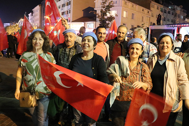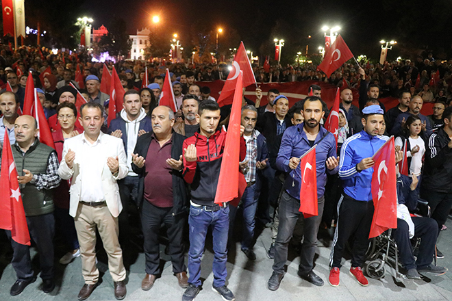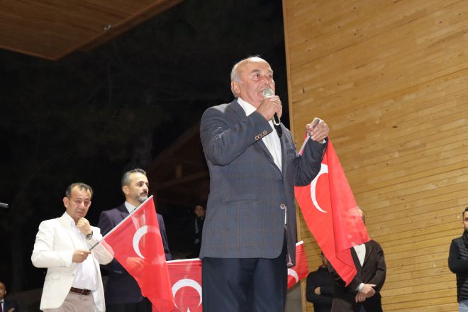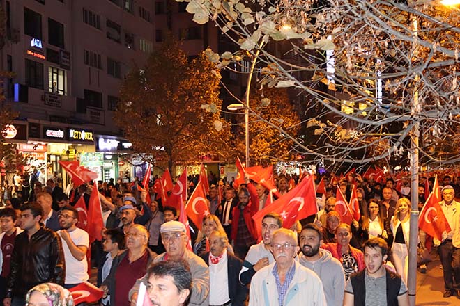 Ak Parti İl Başkanı Nurettin Doğanay binlerce kişiye hitap ederek; “Bazen siyasetin gereği olarak birbirimizi eleştirdiğimiz zamanlar olabiliyor ama Türk milletinin, bu necip milletin 1923’te Gazi Mustafa Kemal Atatürk’ün öncülüğünde ve önderliğinde nasıl yedi düvele karşı dik durduysak, bugün de söz konusu vatansa, sınırımız güvenliği ise PKK, PYD, YPG ve DAEŞ’in hedefi Türkiye’yi parçalamaksa, tüm Avrupa ülkelerinin iş birliği yaparak bize karşı geldilerse Türk milleti doğru yoldadır, doğru istikamettedir. Bizler başta başkomutanımız ile birlikte, askerimizin, polisimizin her daim yanında olacağız. Bugünlerde siyasi çekişmelerden uzak milletimizin birliği ve beraberliği böyle olacağız. Topu üzerimize gelse bizler 1923’teki o ruhla nasıl yedi düvele karşı durduysak bundan sonra da durmaya devam edeceğiz. Ne mutlu Türk’üm diyene!” ifadelerini kullandı.