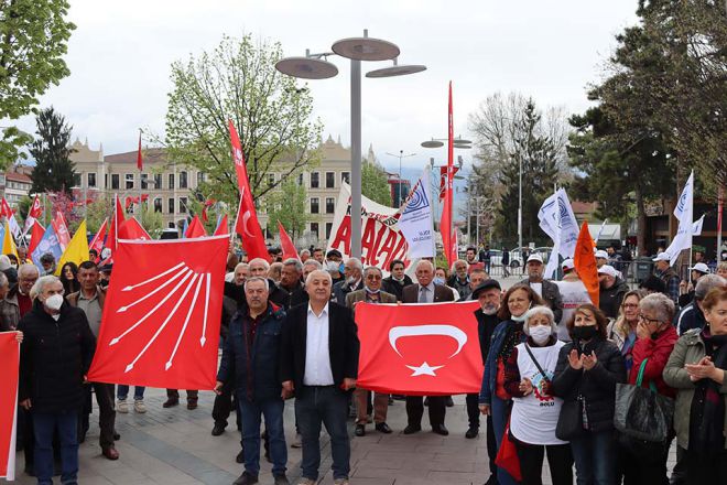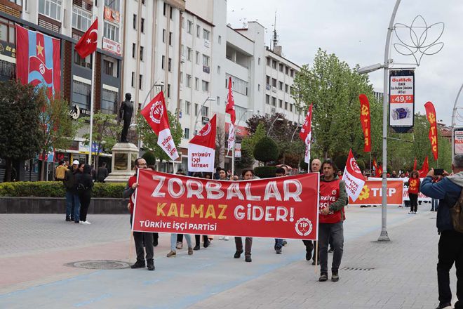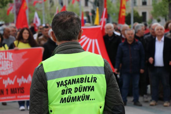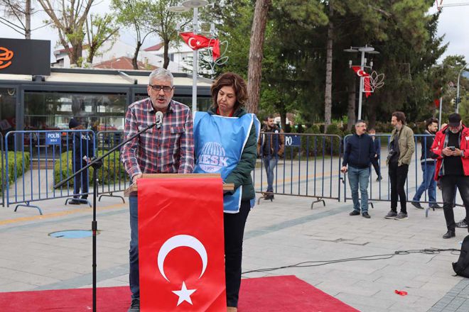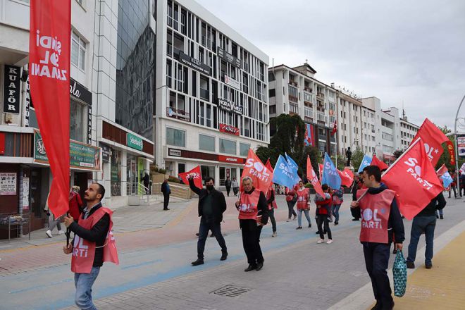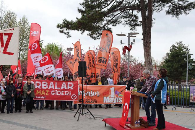 Koçyiğit sözlerini şu şekilde tamamladı; “Yıllardır emeğimizle, alın terimizle insanca çalışma, insanca yaşama mücadelesi veriyoruz. Ancak durumumuz her gün biraz daha kötüleşiyor. Ekmeğimiz her geçen gün küçülüyor. Sömürünün çarkları milyonlarca işçinin, emekçinin canıyla, kanıyla döndürülmeye çalışılıyor. Güvenceli-kadrolu çalışma hakkımız yok sayılıyor, güvencesiz istihdama mahkûm olmamız bekleniyor. Anayasa ile güvence altına alınan çalışma hakkımız ortadan kaldırılıyor, KHK’lar ve geçici 35. Madde eliyle on binlerce kamu emekçisi hukuksuzca ihraç ediliyor. Sendikalı oldukları için binlerce işçi işten çıkarılıyor. Bu düzen yaşamı ve gezegeni tehdit eden büyük bir felakete dönüşmüştür. Gölgesini satamayacağı ağacı kesen kapitalist barbarlığın yarattığı yıkımın faturasını milyonlarca insan canlarıyla, doğa ise geri dönüşü olmayan tahribatlarla ödüyor. Nükleer, termik, jeotermik santraller, siyanürlü maden aramaları, atmosfere, toprağa salınan zehirli gazlar, zehirli atıklar ekolojik krizi derinleştiriyor, yeni pandemilere yol açıyor. Emperyalist savaşlar her geçen gün daha geniş coğrafyalara yayılıyor, savaşın alevleri işçi ve emekçileri yakıyor. Milyonlarca insan yerinden yurdundan olup göç etmek zorunda kalıyor, şehirler yakılıp yıkılıyor. Bu düzen yurttaşların hakkını, hukukunu çiğniyor, adaletsizliği büyütüyor. Seçme, seçilme hakkı yok sayılıyor, belediyelere kayyumlar atanıyor, vekiller cezaevlerine konuyor, cezaevleri tabutluğa ve işkence merkezlerine dönüştürülüyor, kitlesel tutuklamalar hız kesmiyor, bir kez daha parti kapatma davaları ile halk iradesine ipotek konmak isteniyor. Şovenizm, cinsiyetçilik, ırkçılık ve mezhepçilik krizi yönetmenin bir yolu olarak ülkemizin ve halkın geleceğini tehdit ediyor. Savaş ve işgallerle ekmeğimizi küçültüyor, işsizliğimizi büyütüyor, talanların yolunu açıyorlar. İnkârcı ve imhacı siyasetle barış imkânını ortadan kaldırmaya çalışıyorlar. Kürt sorununu çözümsüz kılarak toplumsal gerginliklerden nemalanmak, rant elde etmek, kutuplaşma üzerinden iktidarlarını kalıcı kılmak istiyorlar. Sınıfsal eşitsizliklerin yanı sıra toplumsal cinsiyet eşitsizliği de derinleşiyor, kadınların omuzlarına yıkılan hane içi iş ve bakım yükü artıyor. Kadına yönelik şiddet tırmanıyor. Kadınlar bir yandan işsizliğin, bir yandan esnek çalışma biçimlerinin ve güvencesizliğin hedefi haline geliyor. Bu ateşten günlerde kadınların güçlendirilmesi gerekirken, İstanbul Sözleşmesi gibi kazanımlar iktidarın hedefi oluyor.