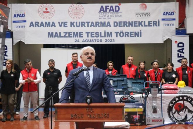 Törende konuşan Vali Kılıç, Kahramanmaraş merkezli depremde binlerce binanın yıkıldığını belirterek, “Bu kadar büyük bir depremin ardından bu kadar kısa sürede kalkması mümkün değildi. Orman yangınlarına karşı da eleştiriler oldu ama havadan mücadele için hava araçları alındı, kiralandı. Devletimiz o kadar güçlü ki en ufak bir yangına dahi helikopter ve uçak gönderiyor. Bunlar devletin ne kadar güçlü olduğunun göstergesi. Bolu’da bulunan vatandaşlarımız depremden sonra çok büyük fedakarlıklarda bulundu. Gerçekten her ile yardım yaptık. Bolu da bir deprem bölgesi ve afetlere müdahale için ne kadar ekip var diye baktım ve yok denecek kadar az olduğunu gördük. AFAD ile birlikte tüm il genelinde ilçelerle birlikte arama kurtarma derneklerinin kurulması gerektiğini fark ettik ve hemen çalışmalara başladık. Bolu’da 22 tane arama kurtarma derneği kurduk. Eğitimleri de AFAD tarafından verildi" ifadelerini kullandı.
