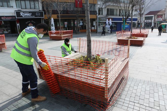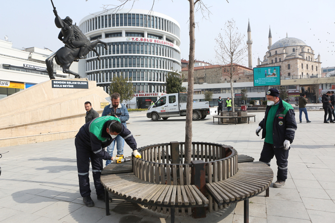 Bolu Belediyesi Covid-19 salgınına karşı önlem üstüne önlem alıyor. Virüsle mücadele için 50 kişilik hijyen timi kuran ve her gün düzenli olarak kamusal alanları dezenfekte eden Bolu Belediyesi, şehir merkezindeki bankları da tedbir amaçlı kaldırdı.