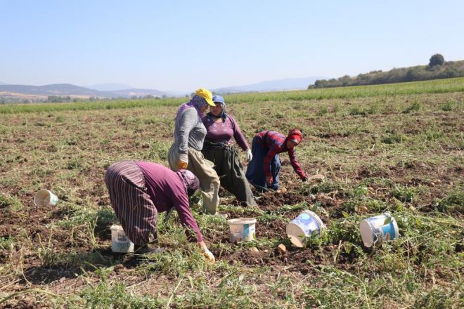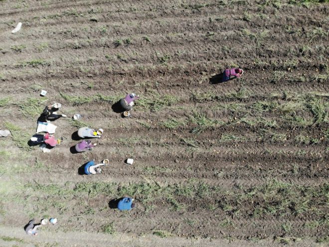Üreticilerin nisan-mayıs aylarında toprakla buluşturduğu patatesler toplanmaya başlandı. Günlüğü 400 lira olan patates toplama işçileri, sıcak havada tarlalarda kovalarla patatesleri topluyor. Kovalarla tarladan toplanan patates, çuvallara doldurularak, traktör römorklarına yükleniyor. Üretici Erdal Özkan, zorlu şartlar altında tarladan sofralara getirilen patateste bu sene dengesiz yağışlar sebebiyle verimin yüzde 30 düştüğünü ifade etti. Yağışların patates verimine etki ettiğini dile getiren Özkan, “Bu sene, geçen seneye göre verim yüzde 30 daha az. Dengesiz yağışlar nedeniyle verim düştü. Yağmur hızlı ve çok yağdı. Patates çizilerinde su birikti. Bu sebeple de çürüme oldu. Ben kendim bu tarlayı 4 kere suladım. Ondan sonra da patates tarlasında fazla ot oldu. 5’nci kez sulamamaya karar verdim” dedi.
