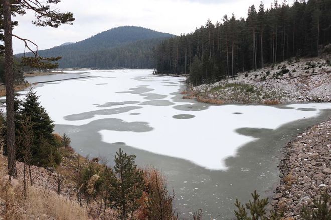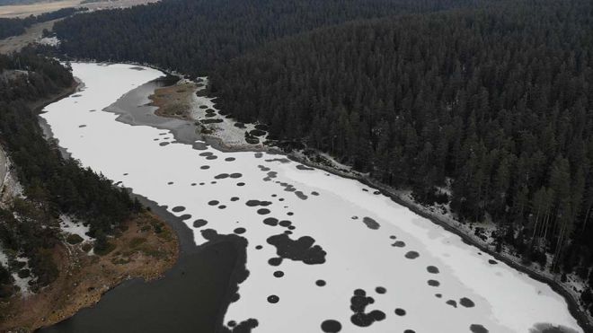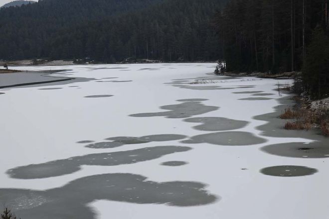 Bolu’da, kar yağışıyla birlikte hava sıcaklıkları gece saatlerinde sıfırın altında 14 dereceye kadar düştü. Hava sıcaklıklarının dondurucu seviyelere gelmesiyle kent merkezine 20 kilometre uzaklıkta bulunan Sarıalan Göleti’nin büyük bölümü buzla kaplandı. Tatillerini yeşil alanlarda geçirmek isteyen tatilcilerin uğrak yeri olan Sarıalan’a giden vatandaşlar buz tutan gölün üzerine çıkmamaları konusunda uyarıldı.