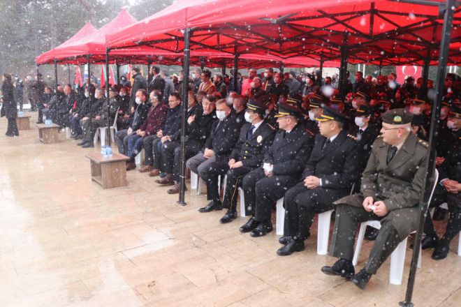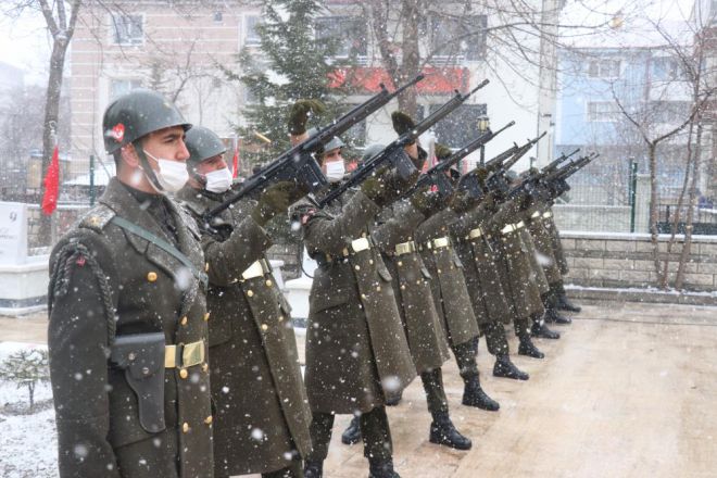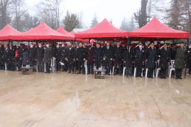 Yoğun kar yağışı altında düzenlenen programda saygı duruşu ve İstiklal Marşının okunmasının ardından şehitler için 3 kez saygı atışı yapıldı. Törende konuşan Binbaşı Ali Çınar, "Kutsal vatan topraklarının bölünmez bütünlüğü, milletimizin egemenlik ve bağımsızlık uğruna canlarını feda eden isimlerini kalbimize yazdığımız aziz şehitlerimizi bu anlamlı günde rahmet ve minnetle yad ediyoruz. Aynı zamanda bugün 107. yıl önce 18 Mart 1915’te şanlı ordumuzun Çanakkale’nin geçilmeyeceğini tüm dünyaya gösterdiği destansı bir zaferin, Çanakkale Deniz Zaferi’nin de yıldönümüdür. Tüm yokluk ve imkansızlıklara rağmen milletimizin kahraman evlatlarının emsalsiz fedakarlıklarıyla kazanılan bu zafer milli mücadelemize ilham verirken Türkiye Cumhuriyeti’nin kuruluşuna giden yolda çok önemli bir kilometre taşı olmuştur” dedi.