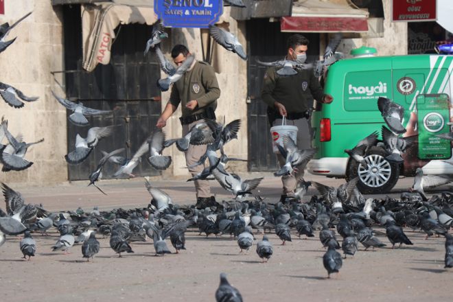 Bolu’da korona virüs salgını sebebiyle hafta sonu getirilen sokağa çıkma kısıtlaması ile birlikte kentin cadde ve sokakları sessizliğe büründü. Vatandaşların sokağa çıkamaması nedeniyle sokak hayvanları Asayiş Şube Müdürlüğü bünyesinde kurulan Çevre, Doğa ve Hayvanları Koruma Büro Amirliği ekipleri tarafından yalnız bırakılmadı. Ekipler, Büyükcami Mahalles'nde bulunan Yıldırım Bayezit Camii’nin avlusunda toplanan güvercin ve kedileri yanlarında getirdikleri yemlerle beslediler. Yüzlerce güvercinin aynı anda kanat çırparak havalanması hoş görüntüler oluşturdu.