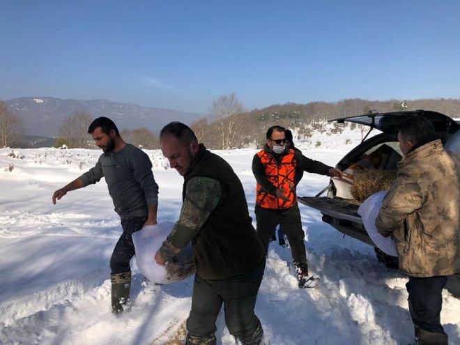 Bolu’da, geçtiğimiz hafta yüksek kesimlerde etkili olan kar yağışıyla birlikte kar kalınlığı 1 metreye yaklaştı. Yağışın ardından soğuk havanın da etkisinde kalan yüksek kesimlerde yaban hayvanları Doğa Koruma ve Milli Parklar ekipleri ve Köroğlu Avcılar Derneği üyeleri tarafından yemlendi. Ekipler, arazi araçlarıyla ulaştıkları Pirahmetler, Küpçüler, Kılıçarslan, Ağaççılar ve Atyaylası mevkilerinde yaban hayvanlarının yaşam alanlarına 250 kilogram besi yemi, 15 balya yulaf ve 150 kilogram sebze atığı bıraktı.