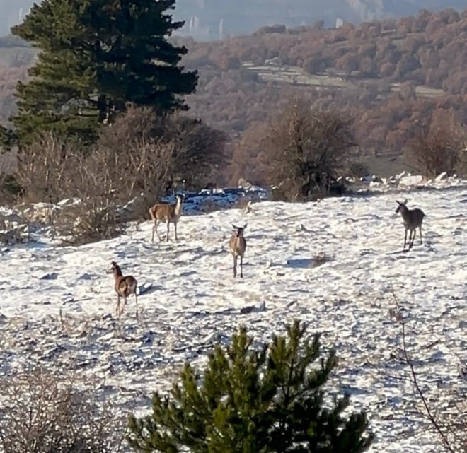 Bolu’nun yüksek kesimlerinde hafta sonu kar yağışı etkili oldu. Kar yağışı sebebiyle yüksek rakımdaki dağlar beyaz örtüyle kaplandı. Kar nedeniyle ormanda yiyecek bulmakta zorlanan hayvanlar yaylaların yakınlarına inmeye başladı. Merkeze yakın bir bölgede bulunan yaylada, karaca sürüsü görüntülendi. Ormanın kar yağmayan bölgelerine yiyecek bulmak için inen karaca sürüsünün yiyecek aradığı görüldü. Sürü halinde dolaşan yabani hayvanlar vatandaş kamerasına yansıdı. Bir süre açıklık alanda yiyecek arayan hayvanlar, ormana girerek bölgeden uzaklaştı.