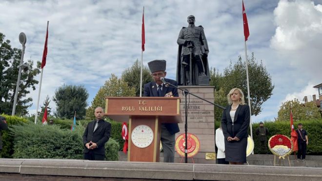 Türkiye Muharip Gaziler Derneği Bolu Şubesi Başkanı İbrahim Çelik konuşmasında, "Mustafa Kemal Atatürk'e 1921 mareşallik ve gazilik unvanı verilmişti. Bu vesileyle bugün gazi günü olarak addedilmiştir. Tarih boyunca hür ve bağımsız yaşamış Türk milleti, işgal vesayete alışık olmayan asil bir millettir. Bu uğurda kendisini kendisini çepeçevre sarmış düşmanlarına karşı üç kıtada kılıç sallamış, zaferden zafere ecdadını örnek alarak Anadolu'da, Kore'de, Kıbrıs'ta, 15 Temmuz 2016'da yapılmaya çalışan hain darbe teşebbüsünde canlarını hiçe sayarak vatan bayrak aşkıyla tarihinde birçok savaşa girerek yüzünün akıyla çıkmıştır. Gaziliğin devlet ve millet nezdindeki önemini Ulu Önder Mustafa Kemal Atatürk 'Kahraman, Türk ordusu sizin kahramanlığınızla kazanılan büyük zaferin millet tarafından dalalet eden bu yönden ve rütbeye ancak sizi izafe ederek bütün askerlik hayatımın en büyük itirafı olarak taşıyacağım' diyerek anlatmaktadır. Öyle ki milli bağımsızlığımızı vatanın milleti ile bölünmez bütünlüğünü muhafaza etmek maksadıyla vatanımızın her karış toprağını, kanlarını akıtan Türk tarihini altın sayfalar yazdıran tarihlerimizin can veren şehitlerimizin hatıralarını yüceltmek onlara minnet şükran duygularımı ifade etmek ve milletimizin en büyük görevidir" dedi.