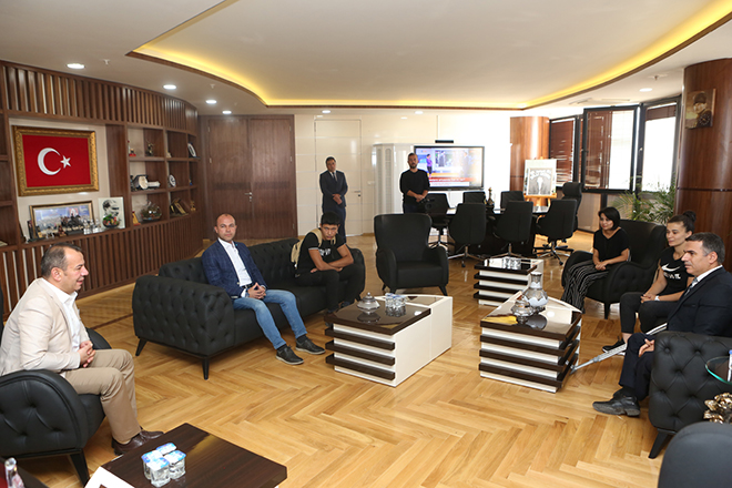 Belediye Başkanı Tanju Özcan, gerçekleşen kabulde, antrenör Nihal Tanrıkulu, idareci Çilem Taşkın ve sporcular Sabri Gülenç ve Zafer Sak ile sohbet ederek, takımın hakkında bilgiler aldı.