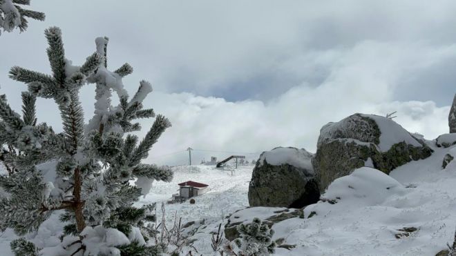 Bolu’nun yüksek kesimlerinde 3 gündür aralıklarla etkili olan kar yağışı çam ağaçlarına beyaz gelinliği giydirdi. Kar yağışının etkili olduğu 2200 rakımlı Köroğlu Dağları’nda karla kaplanan çam ağaçları görsel şölen oluşturdu. Yağan kar nedeniyle zirvede kar kalınlığı 15 santimetreye kadar ulaştı. Bölgede hava sıcaklığının sıfırın altında derecelere düşmesiyle bölgedeki ağaçlar buz tuttu. Öte yandan, çam ağaçlarının beyaz örtüyle kaplandığı anlar ise dronla görüntülendi.