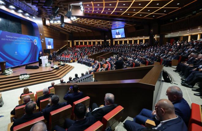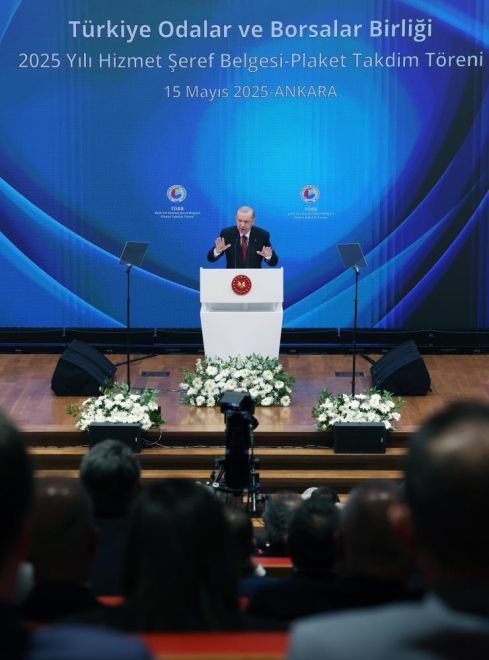 Cumhurbaşkanı Recep Tayyip Erdoğan, Türkiye Odalar ve Borsalar Birliği (TOBB) tarafından düzenlenen 2025 Yılı Hizmet Şeref Belgesi ve Plaket Takdim Töreni'ne katıldı. Törende konuşan Cumhurbaşkanı Erdoğan, program vesilesiyle iş dünyası temsilcileriyle bir araya gelmekten memnuniyet duyduğunu ifade etti. TOBB’un önemli bir geleneği haline gelen bu anlamlı töreninin her yıl mayıs ayında gerçekleştirildiğini belirten Erdoğan, "Bugün bir kez daha bu güzel atmosferde gönüllerimizi buluşturan Sayın Başkana ve birlik yönetimine teşekkür ediyorum" dedi.