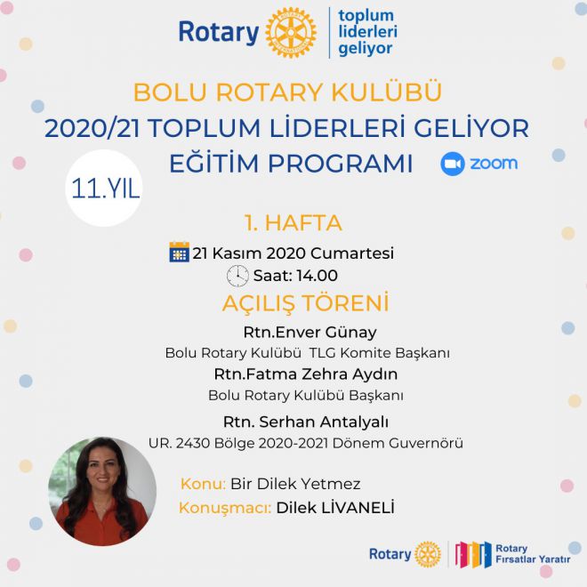 Konusunda uzman konuşmacı konuklar ve konularla ZOOM üzerinden gerçekleşecek seminerler dizisiyle, dört hafta boyunca Pandemi’ yi fırsata dönüştürecek eğitimlerle gençler buluşacaklar. Bolu Rotary Kulübü Başkanı F.Zehra Aydın ‘’İnternet üzerinden ücretsiz olarak verilecek bu eğitimler, gençlerimizin mesleğe geçiş sürecinde bir rehber niteliğinde.21 Kasım tarihinde başlayacak ve dört haftasonu cumartesi günleri gerçekleşecek bu program; kulübümüz ve BAİBÜ tarafından yıllardır devam eden, başarısı kanıtlanmış, hatta tez haline getirilmiş bir seminerler dizisi.Bu yıl 11.yılını fiziki olamasa da ZOOM ekranları üzerinden yapabiliyor olmanın haklı gururunu yaşıyoruz.Yıllardır fiziki olarak 80-100 öğrenci ile sınırlandırmak zorunda kaldığımız program, bu yıl 260 öğrencinin kayıt olması ile rekor bir sayıya da ulaştı. Pandeminin FIRSATLAR YARATTIĞI bir program gerçekleştireceğiz.21 Kasım cumartesi günü Dilek LİVANELİ öğretmenimizle başlayacak, konu ve konuşmacılarla ilgili her hafta kamuoyunu bilgilendireceğiz.’’ şeklinde konuştu.