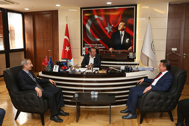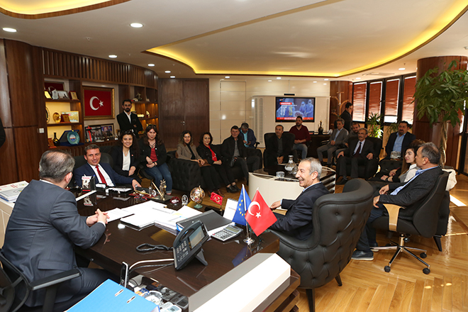 Cumhuriyet Halk Partisi (CHP) Bolu Merkez İlçe Başkanlığı’nın 11 Ocakta gerçekleşen Olağan Kongresi’nde delegelerin oyları ile güven tazeleyen İlçe Başkanı Ersan Türkoğlu, yönetim kurulu üyeleri ile birlikte Bolu Belediye Başkanı Tanju Özcan’a nezaket ziyaretinde bulundular. Çarşamba günü öğleden sonra gerçekleşen ziyarette Bolu Belediye Başkanı Tanju Özcan, CHP Merkez İlçe Yönetimi’ni makamında ağırladı. Sohbet havasında geçen buluşmada CHP’li Türkoğlu, Başkan Özcan’a kongre sonrasında nezaket ziyaretlerine başladıklarını ifade ederek, ardından yaptıkları ve yapacakları çalışmalar hakkında bilgiler verdi. Başkan Özcan da CHP’li Türkoğlu ve yönetimini tebrik ederek, başarılar diledi.
