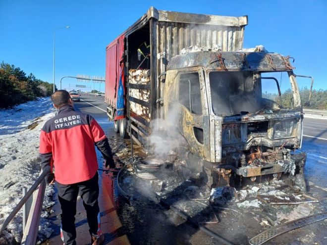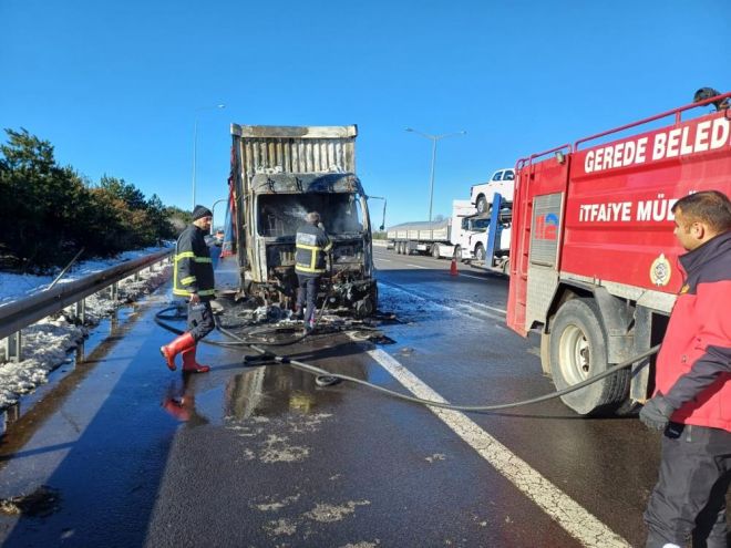 Yangın, Anadolu Otoyolu’nun Bolu geçişinde Gerede ilçesinde meydana geldi. Edinilen bilgiye göre, Ankara istikametinde seyreden sürücüsünün ismi öğrenilemeyen 06 CEY 661 plakalı çikolata hammaddesi taşıyan kamyonun balatalarından duman yükselmeye başladı. Kamyon sürücüsü aracını emniyet şeridine park ederek durumu 112 Acil Çağrı Merkezi’ne bildirdi. Balatalardan çıkan dumanlar kamyonun ön kısmını sardı. Alevlerin giderek büyüdüğü yangın, kamyon kasasında bulunan çikolata hammaddesine sıçradı. Bölgeye sevk edilen Dörtdivan Belediyesi İtfaiye Amirliği ekipleri tarafından alev alev yanan kamyonu söndürmek için müdahale edildi. Yangın nedeniyle kamyon kullanılamaz hale geldi.