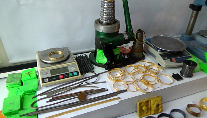 Suç örgütü üyelerinin adreslerinde ele geçirilen bilezik, zincir bileklik, küpe, kolye ve yüzük gibi çeşitli ziynet eşyası ile bu sahte veya ayarı düşük altınların imalatında kullanılan çok sayıda materyallerin sergisi yapıldı.