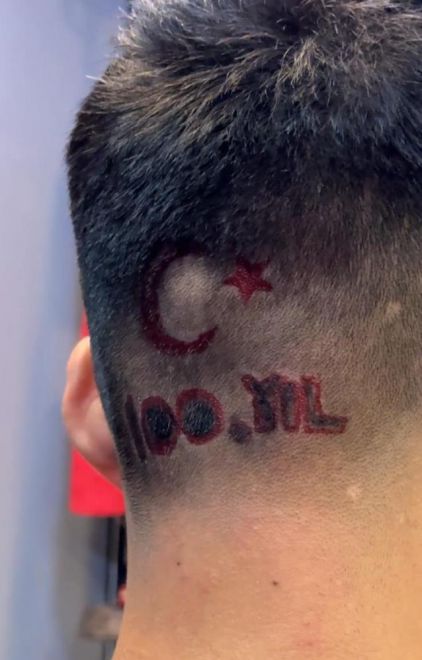 Bolu'nun Tabaklar Mahallesi’nde faaliyet gösteren berber Mehmet Kızıloğlu, Cumhuriyetin 100. yılına özel bir tasarım yapmak için gelen müşteriye talepte bulundu. Müşterinin talebi olumlu karşılaması üzerine berber Kızıloğlu, ay ve yıldız simgelerini ustura ile müşterisinin saçlarına çizdi. Daha sonra 100. yıl simgesini de müşterisinin kafasına kazıyan Kızılıoğlu, yapılan işlemlerin ardından ay-yıldız ve 100. yıl yazısını kırmızı renkte boyadı.