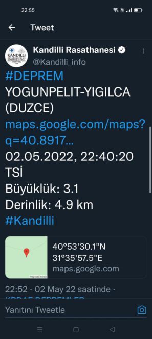 Kandilli Rasathanesi’nden alınan bilgilere göre, Düzce’nin Yığılca ilçesine bağlı Yoğunpelit köyünde 22.40'ta yerin 4.9 kilometre derinliğinde 3.1 büyüklüğünde deprem meydana geldi. Deprem Bolu, Zonguldak ve Düzce’de hissedilirken, deprem sonrası olumsuz bir ihbarın bulunmadığı bilgisi paylaşıldı.