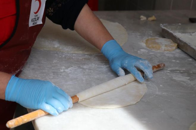 Kahramanmaraş, Hatay, Antakya, Malatya, Adıyaman’dan gelen depremzede kadınlar ile Bolu’nun maharetli kadınları, Otelcilik Turizm Meslek Lisesi Uygulama Oteli mutfağında yörelerine ait bayram tatlılarını yaptı. Un, su, yağ ve yumurta birleştirildi, hamurlar yoğuruldu. Ellerine oklavayı alan kadınlar birbirinden lezzetli tatlılar için hamur açtı. Bir yandan Hatay’dan getirilen taş kadayıfların içi ceviz ve şekerle buluşturuldu, öte yandan Adıyaman’a ait irmik helvası kavruldu, Malatya’nın basma tel kadayıfı şerbetle buluşturuldu.