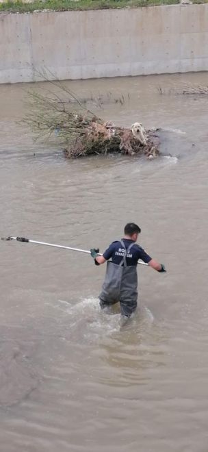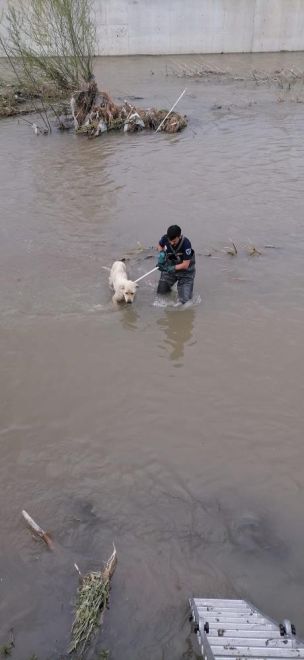 Edinilen bilgiye göre, Berk Mahallesi'nde bulunan deredeki ağaç parçasının üzerin çıkan köpek, dereden çıkamadı. Köpeğin mahsur kaldığını gören vatandaşlar durumu itfaiye ekiplerine bildirdi. İhbar üzerine olay yerine itfaiye ekipleri sevk edildi. Ekipler, merdiven yardımıyla dereye inerek köpeğin mahsur kaldığı yere gitti.