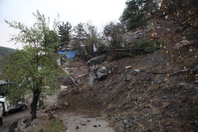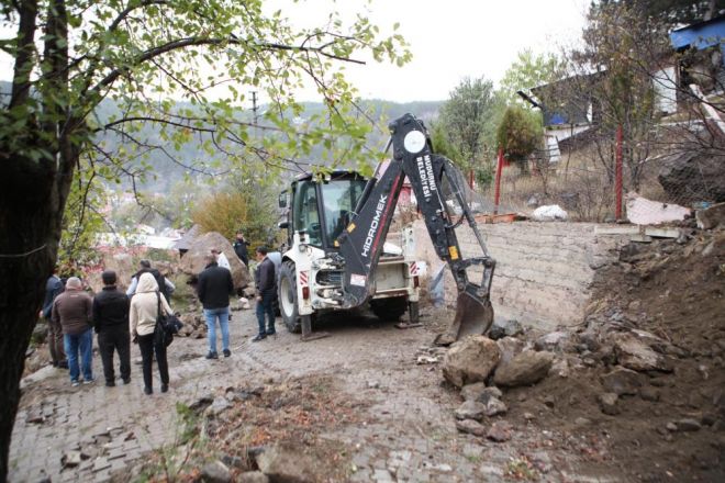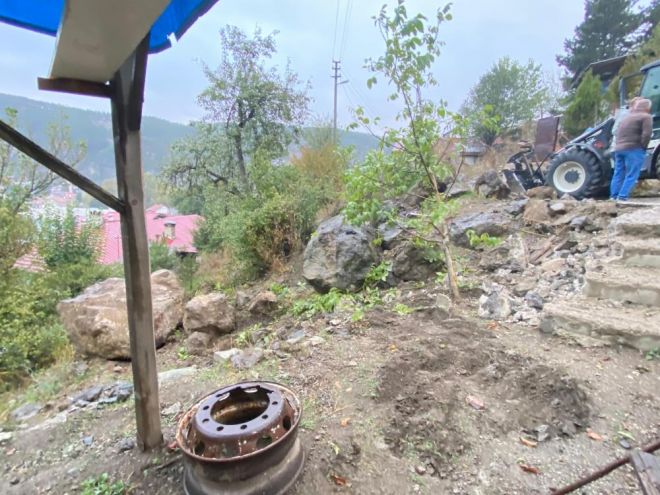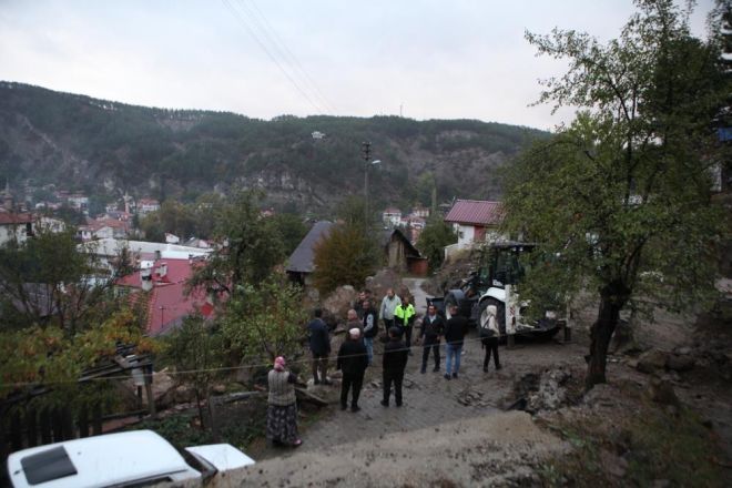 Mudurnu ilçesinde 2 gündür etkili olan sağanak hayatı olumsuz etkiledi. Yağışlar sebebiyle yumuşayan topraktan kayan dev kaya, ilçe merkezine düştü. Dağlık alana yakın bulunan Karaaslan Sokak'a düşen dev kaya, paniğe neden oldu. Kaldırım taşlarına hasar veren kayayı gören vatandaşlar durumu yetkililere bildirdi. İhbar üzerine belediye yetkilileri ve AFAD ekipleri alana sevk edildi. Kayanın kaldırılması için yolda çalışma başlatıldı.