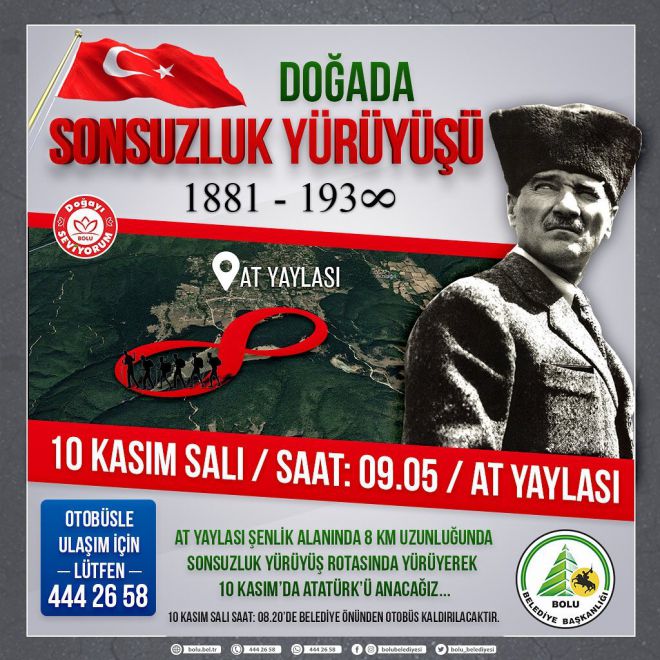 Bolu Belediyesi, 10 Kasım’da Gazi Mustafa Kemal Atatürk anısına At Yaylası’nda saat 09.05’de başlayarak “Sonsuzluk Yürüyüşü” gerçekleştirecek. 8 kilometre uzunluğundaki parkurda düzenlenecek ‘Sonsuzluk Yürüyüşü için 10 Kasım günü saat 08.20’de belediye önünden ücretsiz araç kaldıracak. Ücretsiz ulaşımdan faydalanmak isteyenlerin 9 Kasım 2020 Pazartesi günü mesai bitimine kadar 444 26 58 numaralı çağrı merkezini aramaları ve isimlerini yazdırmaları gerekiyor…